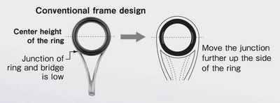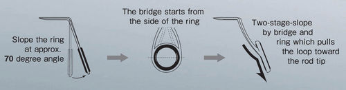 Having discovered that the factor why the loop come round to the front of the guide is, that the junction of ring and bridge is low in conventional structure, Fuji decided to move the junction further up the side of the ring. But the loop still sometimes came round to the front of the guide(tip top side) even with the new structure.